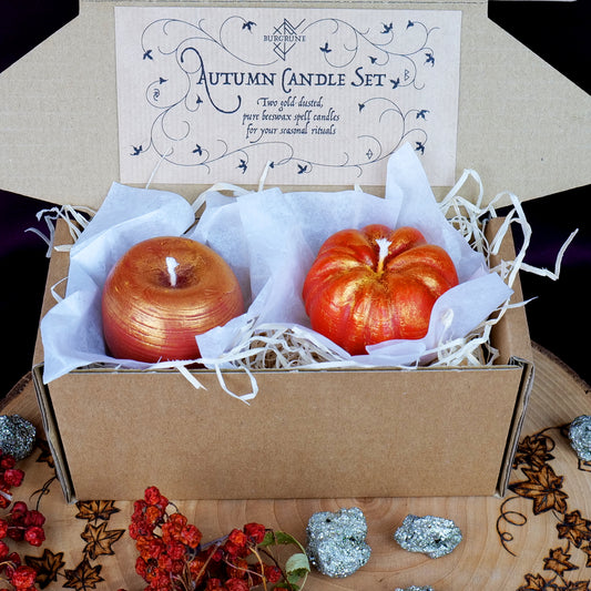Welcome to Burgrune's Candle Collection, where you’ll find our range of ritual and spell candles, carefully handcrafted to bring warmth and enchantment into your home and altar space. For each magical season you’ll find new and exciting additions, from chunky taverncore candles in autumn colours, gilded apple and pumpkin sets for Samhain, to our hand poured Yule Spirit candles topped with fragrant cloves and cinnamon, we always offer new and inspiring pieces for the Sabbats that will light up your rituals with a touch of joy and magic.